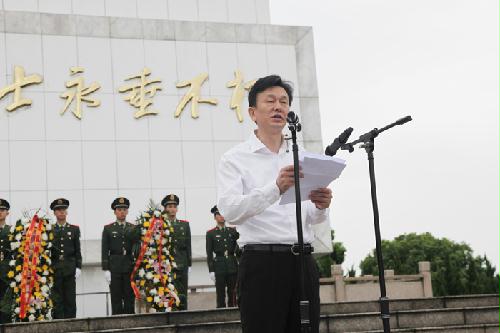 市委书记沈觅为花篮整理缎带并讲话。他在讲话中向在革命事业中牺牲的烈士致以崇高的敬意和沉痛的哀悼,向烈士的家属表示亲切的慰问!向一直以来为继承先烈遗志、弘扬烈士精神做出突出贡献的社会各界人士表示衷心的感谢!并号召全市干群充分继承和发扬革命先烈的光荣传统,大力弘扬民族精神和爱国主义精神,扎实做好各项工作,以更加饱满的热情,更加昂扬的斗志,更加务实的作风,克难攻坚,苦干实干,牢牢把握“现代田园城、美丽金太仓”建设目标,统筹抓好改革发展稳定各项工作,经济社会实现持续健康发展。